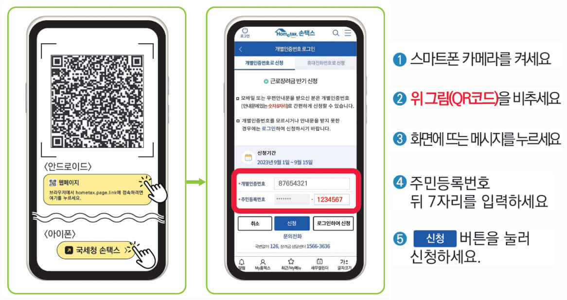 신청안내문에 있는 QR 코드 스캔 → 개별인증번호가 채워진 홈택스 모바일앱 신청화면으로 이동 → 로그인 없이 주민등록번호 7자리 입력 → 신청