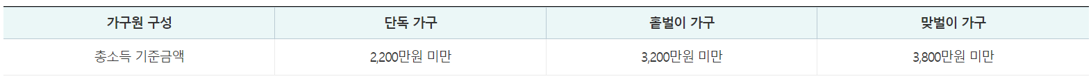2022년 부부합산 연간 총소득 합계액 및 2023년 부부합산 연간 근로소득 합계액이 가구원 구성에 따라 정한 아래 총소득 기준금액 미만이어야 합니다.