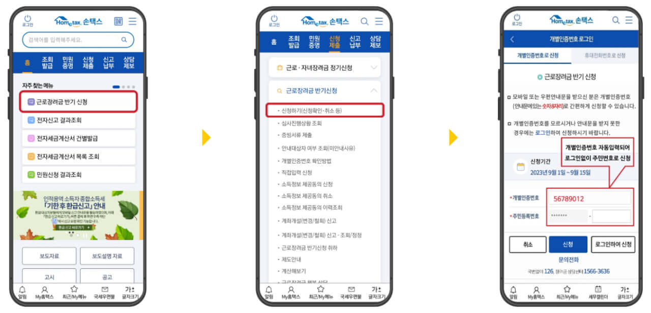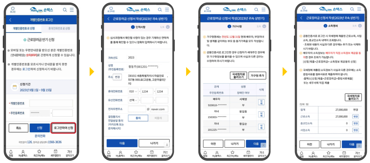 - 홈택스 접속 → 장려금·연말정산·기부금 → 근로장려금 반기 → 신청하기