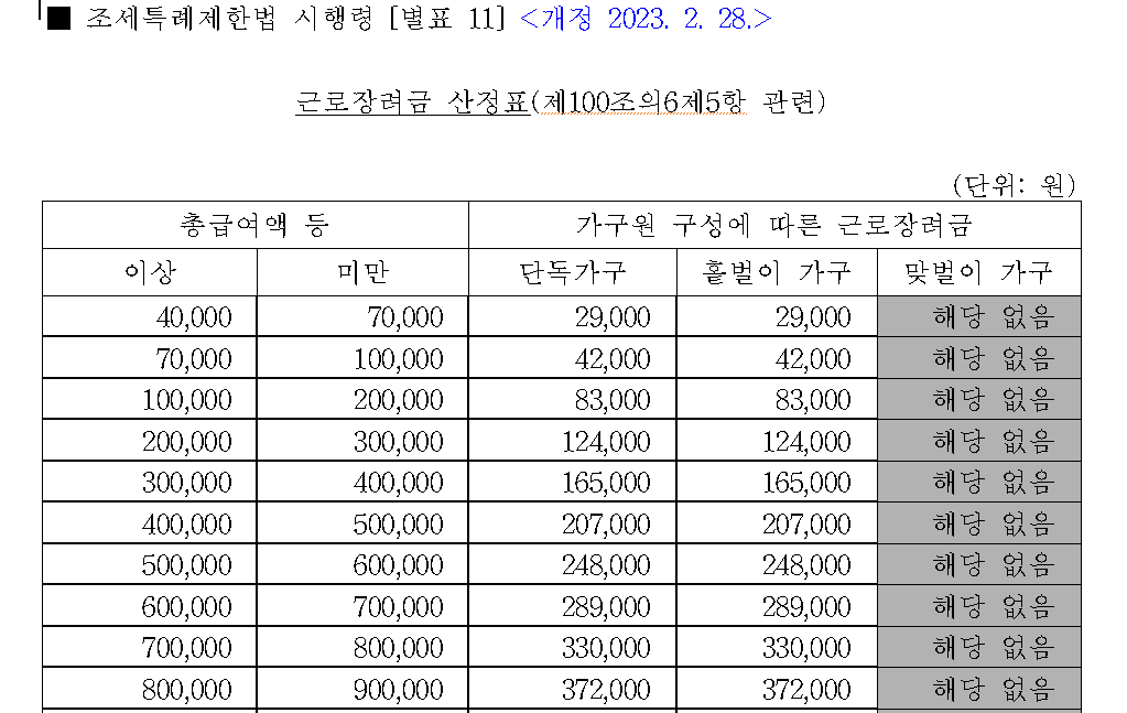근로장려금 산정표