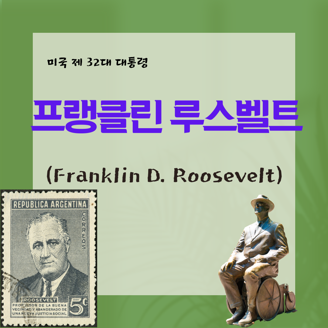 프랭클린 델러노 루스벨트(Franklin Delano Roosevelt, FDR, 1882년 1월 30일 ~ 1945년 4월 12일)는 1933년부터 1945년 사망할 때까지 미국의 32대 대통령 (재임 1933∼1945)을 역임한 미국의 정치인입니다. 민주당 출신으로 미국 역사상 유일무이한 4선 대통령입니다. 1921년 39세의 나이에 두 다리가 불구가 되는 소아마비에 걸렸습니다. 장애를 극복하고 1928년 뉴욕 주지사, 1933년 대통령에 당선되었습니다. 1945년 4월 세계대전의 종결을 보지 못하고 뇌출혈로 사망하였습니다. 이 칼럼에서는 대공황 극복을 위한 뉴딜정책, 제2차 세계대전 당시 리더십, 정치적 유산과 영향력에 대하여 살펴보겠습니다.