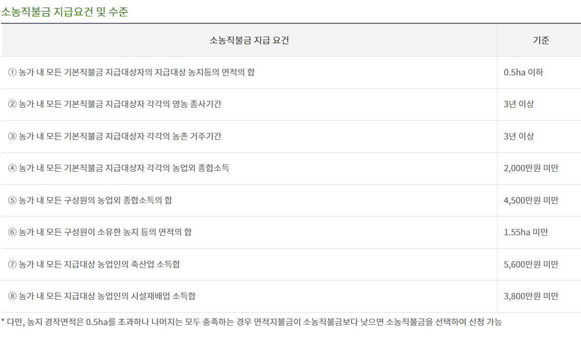 소농직불금은 개인 경작면적, 농가 소유면적, 영농 종사기간, 농촌 거주기간, 농외소득 등을 모두 충족하는 농가에게 면적에 관계없이 130만 원 지급됩니다.